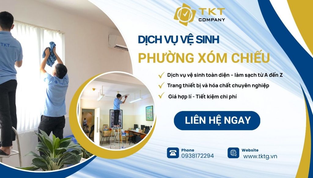 Nếu bạn đang tìm kiếm một đơn vị cung cấp dịch vụ vệ sinh Phường Xóm Chiếu uy tín, linh hoạt theo nhu cầu và hỗ trợ nhanh chóng, thì TKT Company chính là sự lựa chọn đáng tin cậy. Với hơn 15 năm kinh nghiệm hoạt động trong lĩnh vực cùng quy trình vệ sinh chuyên nghiệp, chúng tôi cam kết mang lại không gian sạch sẽ, gọn gàng và an toàn cho mọi công trình. Gọi ngay đến HOTLINE của TKT Company để nhận báo giá chi tiết và trải nghiệm dịch vụ vệ sinh chuyên sâu chất lượng nhất!